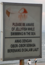 After the sumptuous meal, freshened up and headed to town centre to change our departure date since we decided to extend the trip. Bought loads of stuff and then stashed them in our hotel room, before heading down to the beach which was just through the hotel's back door. The water didn't look blue as shown in the wall poster but even if it was blue, I wouldn't wanna go down and swim with jellyfishes lurking nearby. Spongebob would love this place I guess - jellyfishing.